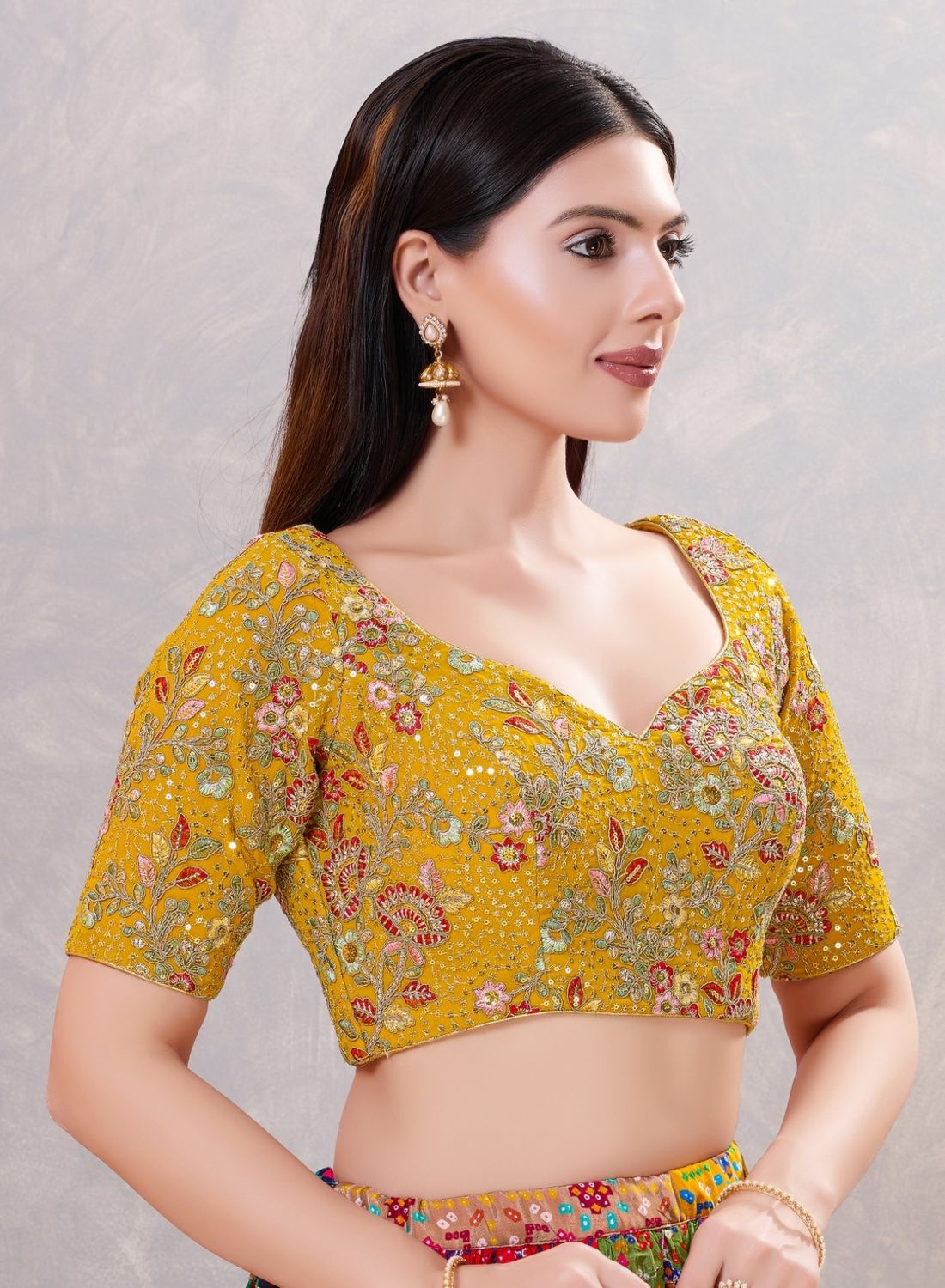 Radiate traditional elegance with our Mustard Bloom Blouse. This piece features a vibrant mustard base enriched with dense, multi-colored floral embroidery in shades of red, pink, and mint green. The intricate threadwork is highlighted by subtle sequin accents that provide a delicate shimmer throughout the garment.