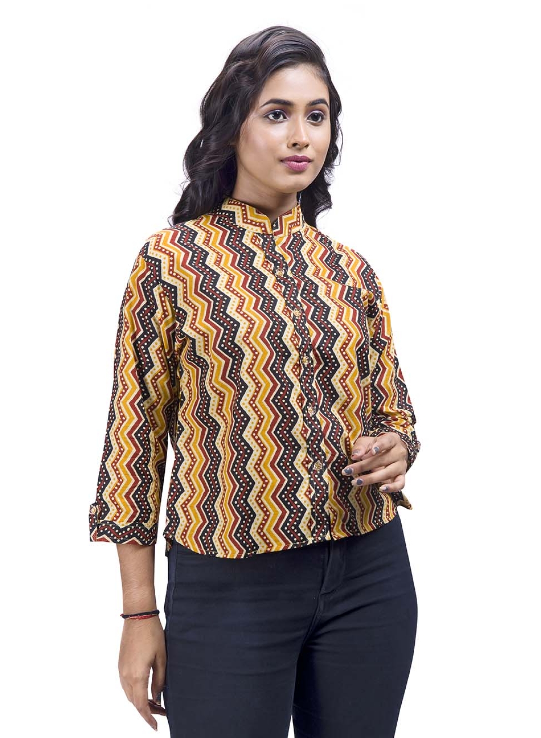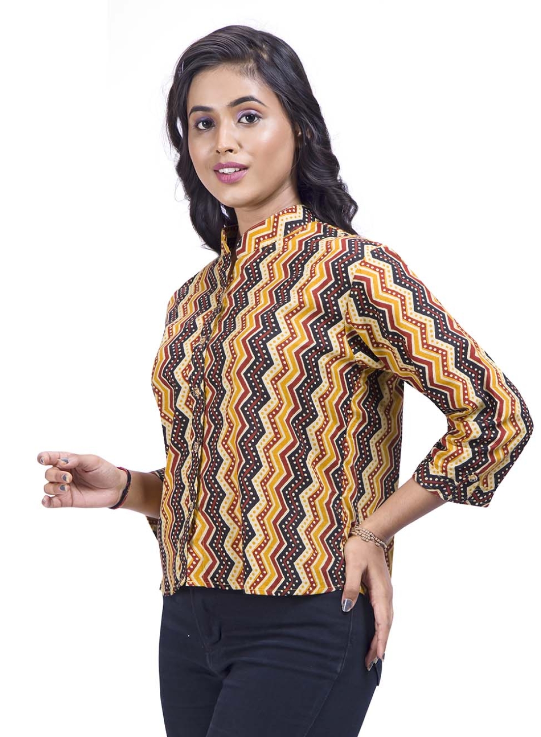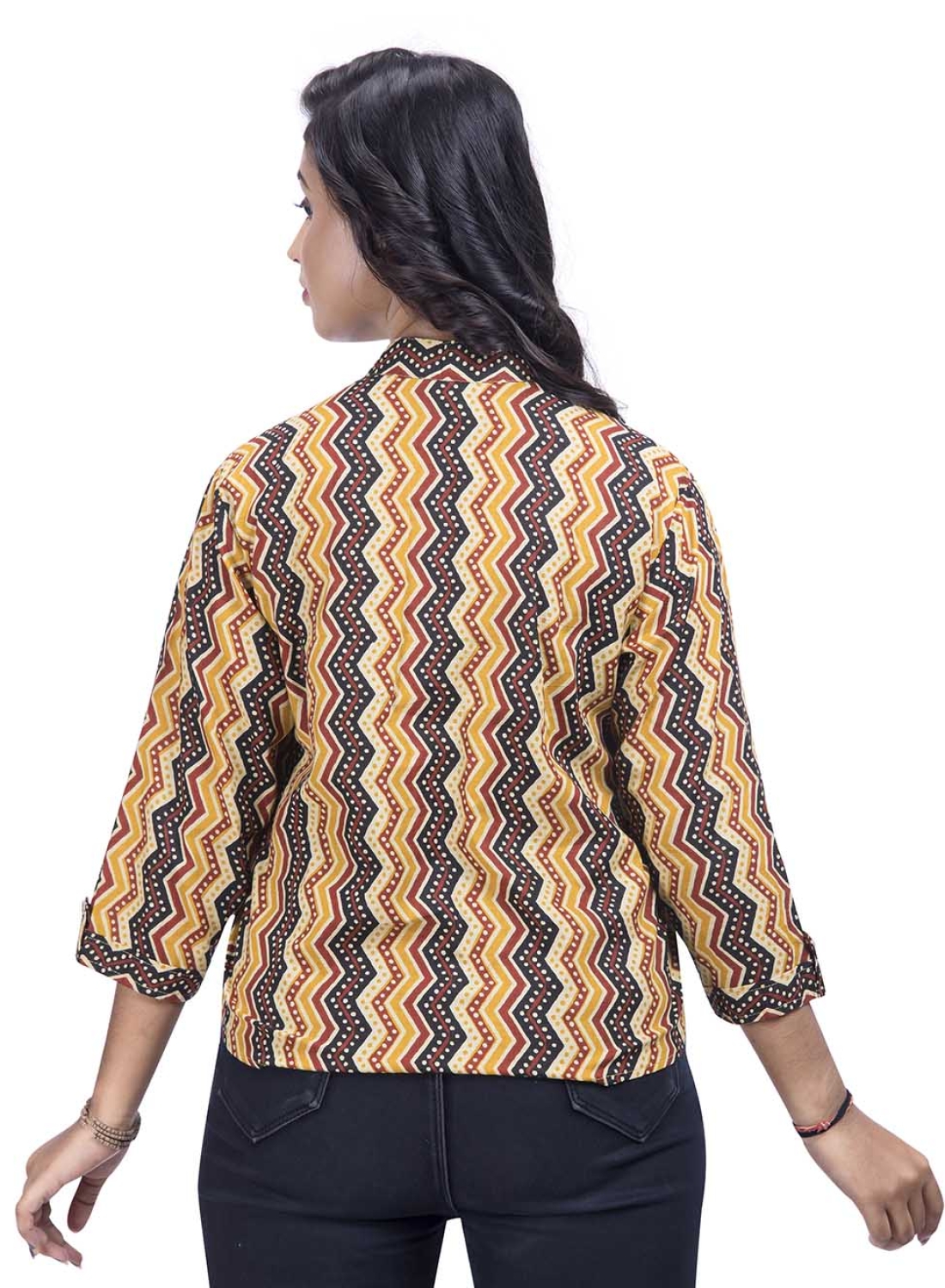 Desi India Women's Chevron Print Mandarin Collar Jacket, 3/4 Sleeves, Yellow and Black Pattern