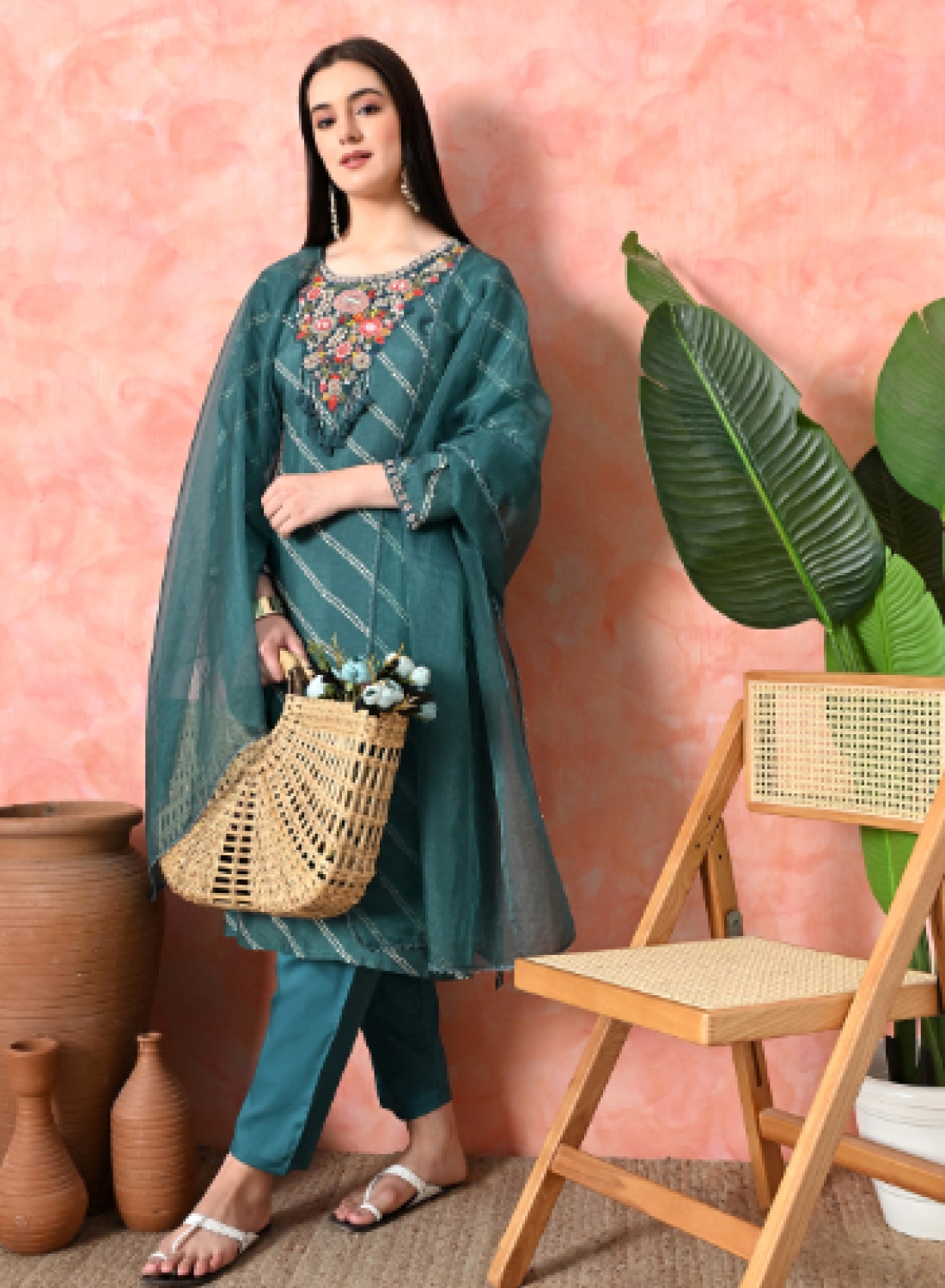 - Elevate your ethnic wardrobe with this stunning designer salwar suit set in a sophisticated teal green shade. The suit features an elegant diagonal striped pattern embellished with delicate white detailing throughout. The highlight is its exquisite floral embroidery work around the neckline, showcasing vibrant coral, pink, and multicoloured thread work with intricate details. The full-sleeved kameez is perfectly complemented by matching straight-cut trousers and a flowing dupatta in the same rich shade. The ensemble's modern silhouette combines traditional craftsmanship with contemporary style, making it perfect for festive occasions, celebrations, or special events. The comfortable fit and premium fabric ensure both style and ease of movement. The suit is adorned with beautiful tassels and decorative elements that add a touch of grace to the overall design. This versatile three-piece set brings together classic elegance with modern sophistication, making it a must-have addition to your ethnic wear collection.