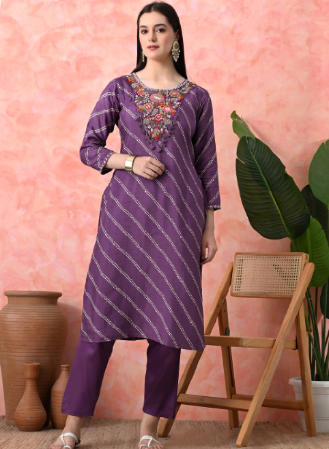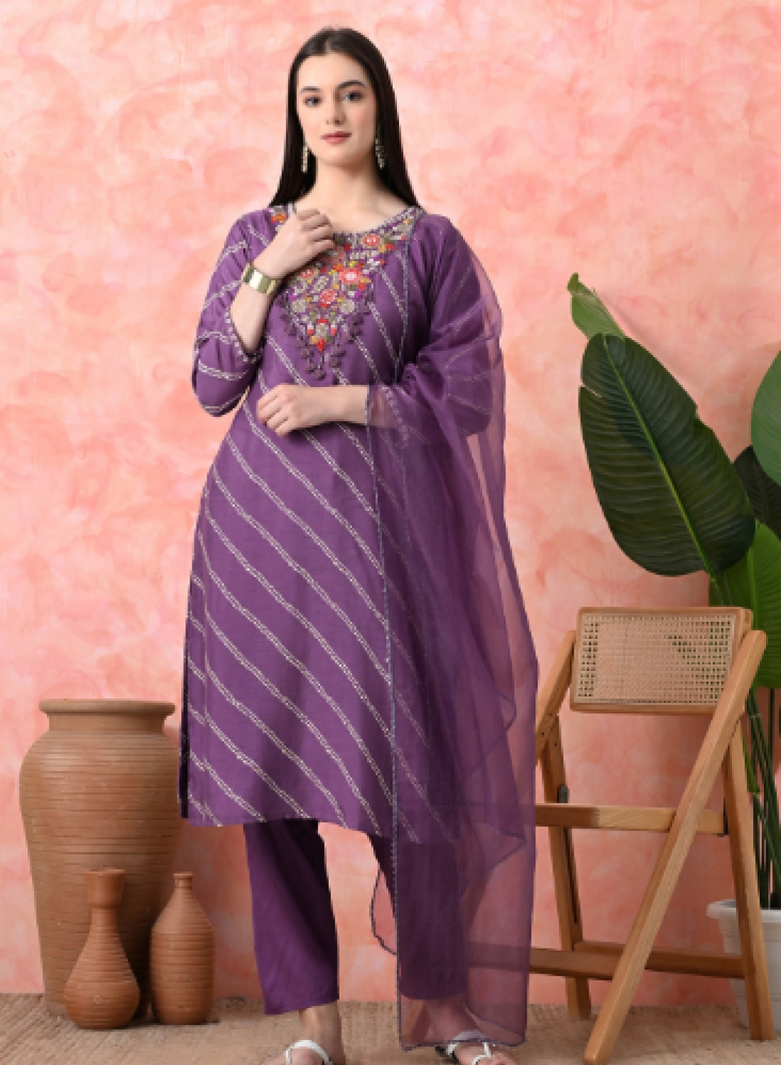 - Elevate your ethnic wardrobe with this stunning designer salwar suit set in a sophisticated mauve shade. The suit features an elegant diagonal striped pattern embellished with delicate white detailing throughout. The highlight is its exquisite floral embroidery work around the neckline, showcasing vibrant coral, pink, and multicoloured thread work with intricate details. The full-sleeved kameez is perfectly complemented by matching straight-cut trousers and a flowing dupatta in the same rich shade. The ensemble's modern silhouette combines traditional craftsmanship with contemporary style, making it perfect for festive occasions, celebrations, or special events. The comfortable fit and premium fabric ensure both style and ease of movement. The suit is adorned with beautiful tassels and decorative elements that add a touch of grace to the overall design. This versatile three-piece set brings together classic elegance with modern sophistication, making it a must-have addition to your ethnic wear collection.