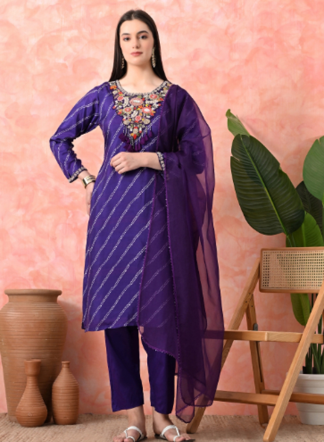 - Elevate your ethnic wardrobe with this stunning designer salwar suit set in a sophisticated purple shade. The suit features an elegant diagonal striped pattern embellished with delicate white detailing throughout. The highlight is its exquisite floral embroidery work around the neckline, showcasing vibrant coral, pink, and multicoloured thread work with intricate details. The full-sleeved kameez is perfectly complemented by matching straight-cut trousers and a flowing dupatta in the same rich shade. The ensemble's modern silhouette combines traditional craftsmanship with contemporary style, making it perfect for festive occasions, celebrations, or special events. The comfortable fit and premium fabric ensure both style and ease of movement. The suit is adorned with beautiful tassels and decorative elements that add a touch of grace to the overall design. This versatile three-piece set brings together classic elegance with modern sophistication, making it a must-have addition to your ethnic wear collection.