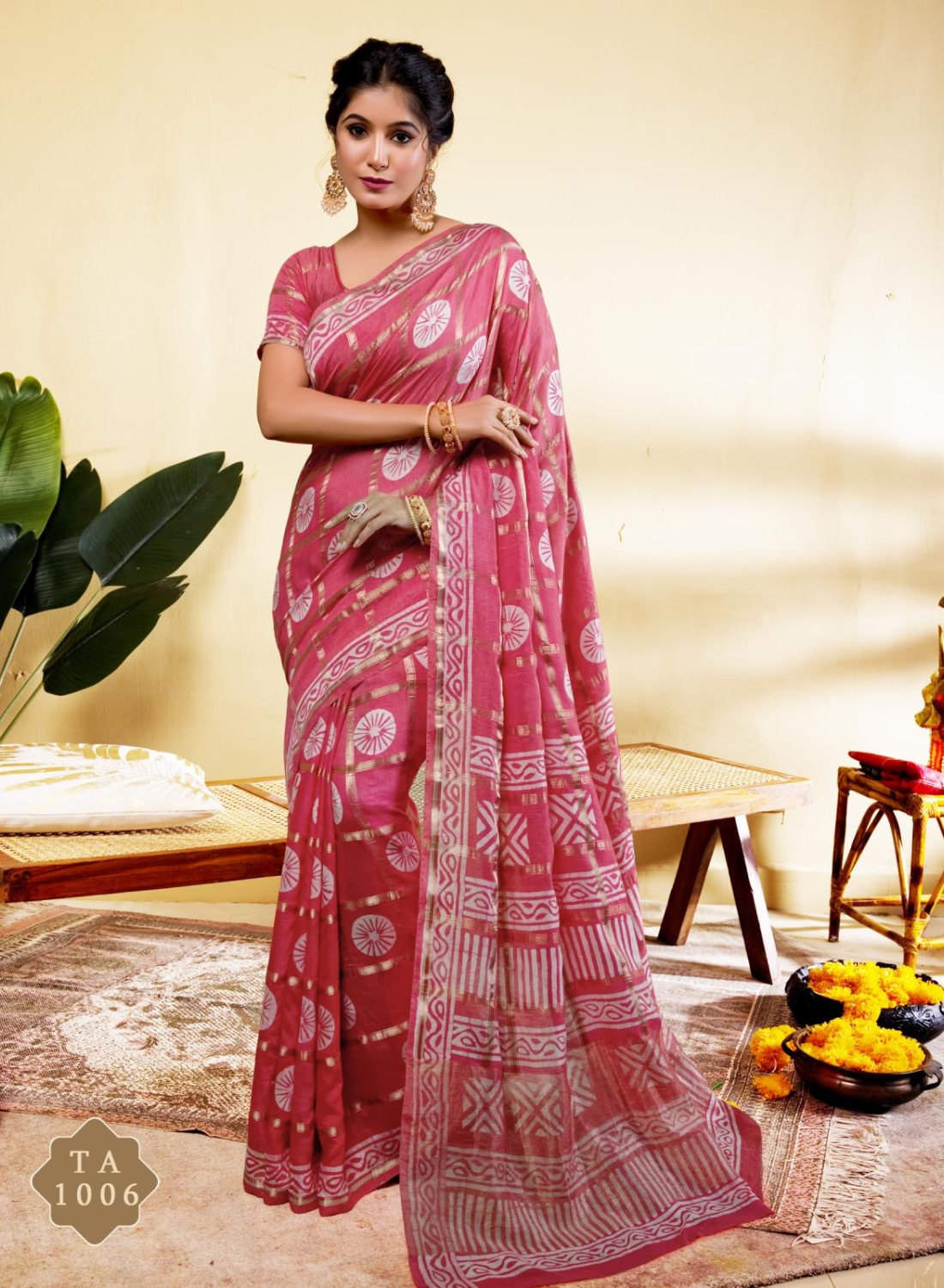 Elegant Rose Pink Block Print Saree
