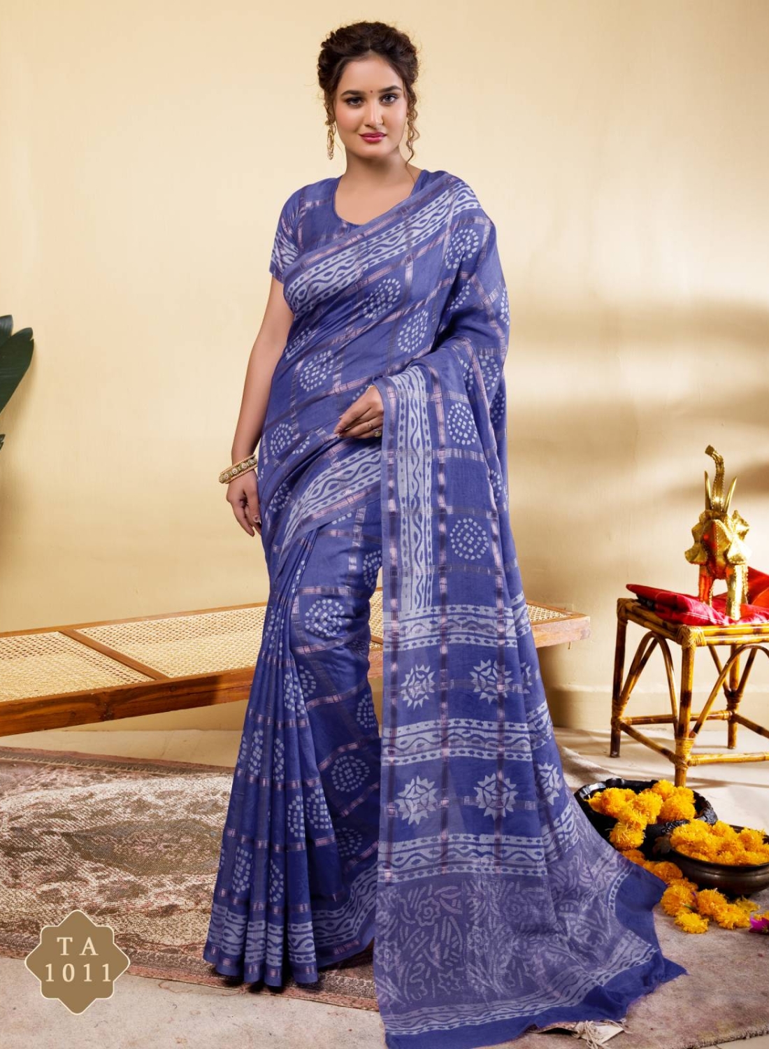 Product HighlightsFabric: Premium Soft Viscose – known for its buttery-soft texture and gentle luster. Design: Intricate white block-print patterns featuring a mix of floral, geometric, and circular motifs. Border & Pallu: Accented with delicate metallic-toned stripes that add a touch of understated glamour. Color: Deep Periwinkle / Indigo Blue with crisp white detailing. Occasion: Perfect for Workwear, Semi-formal events, Brunches, or Daytime festivities.