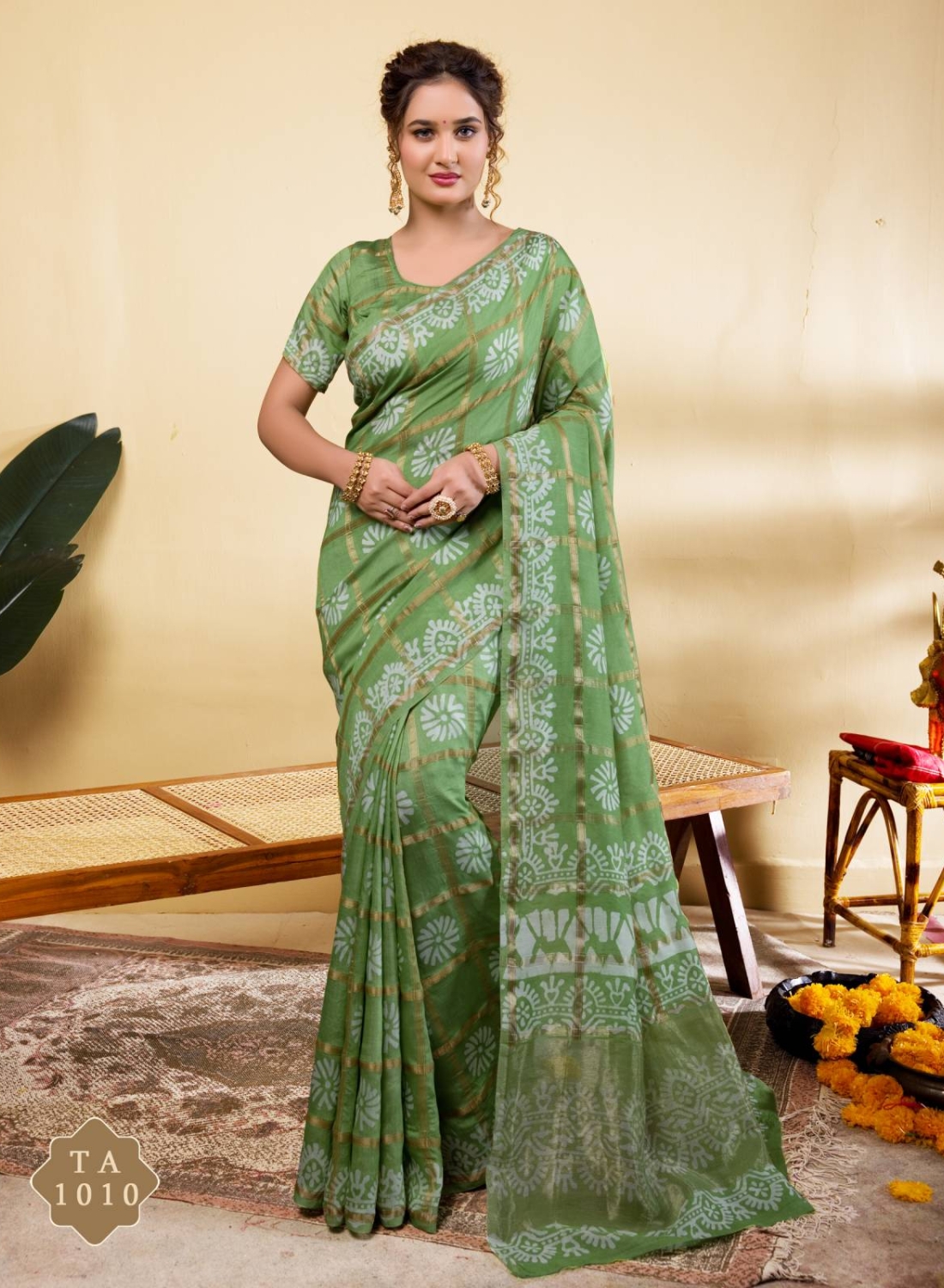 Design: Adorned with white block-print style botanical and sunburst motifs that pop against the lush green backdrop.