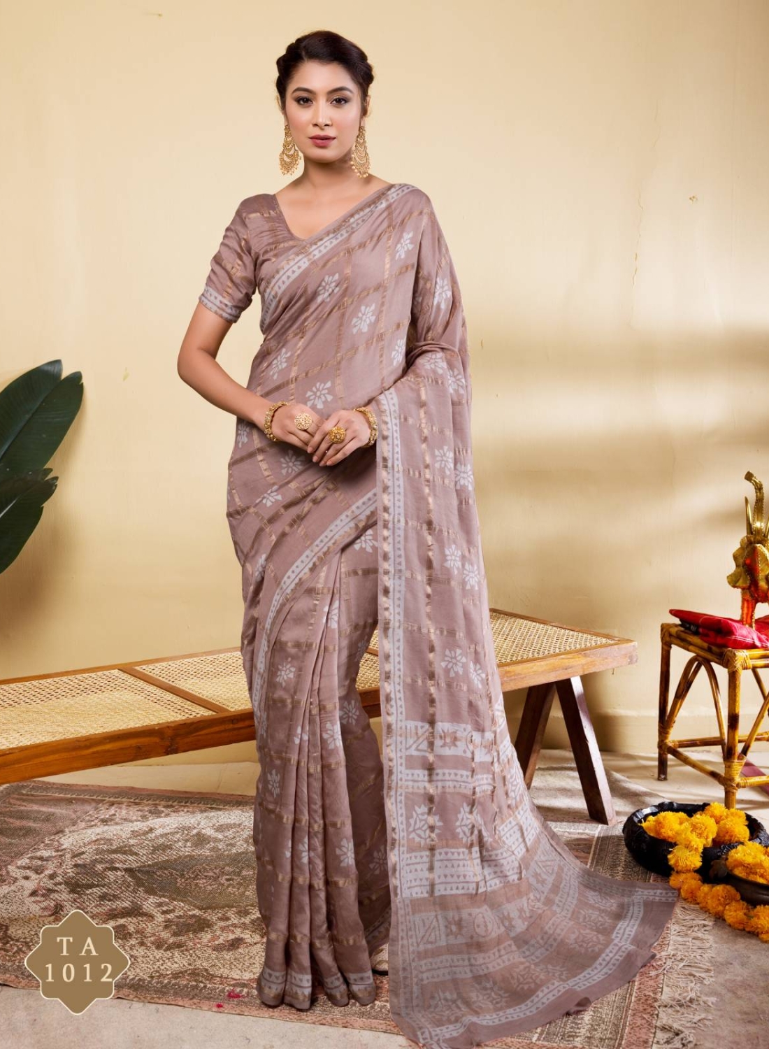 Design Details: Features delicate white block-print style florals and shimmering golden-beige stripes that catch the light beautifully.