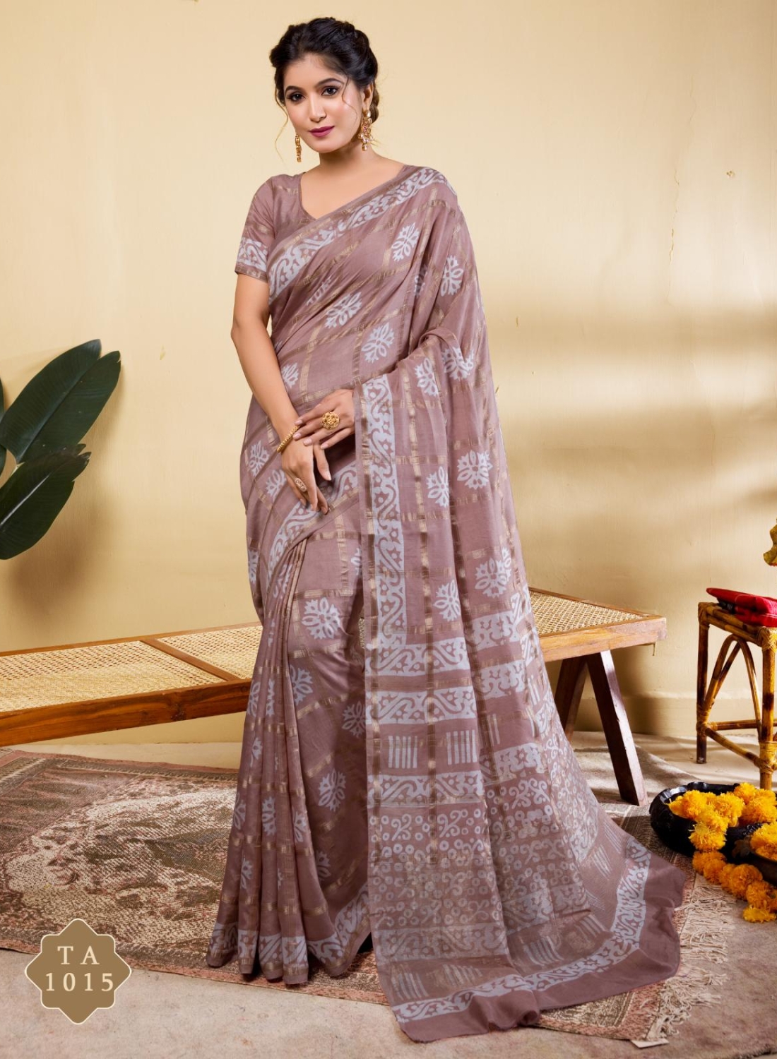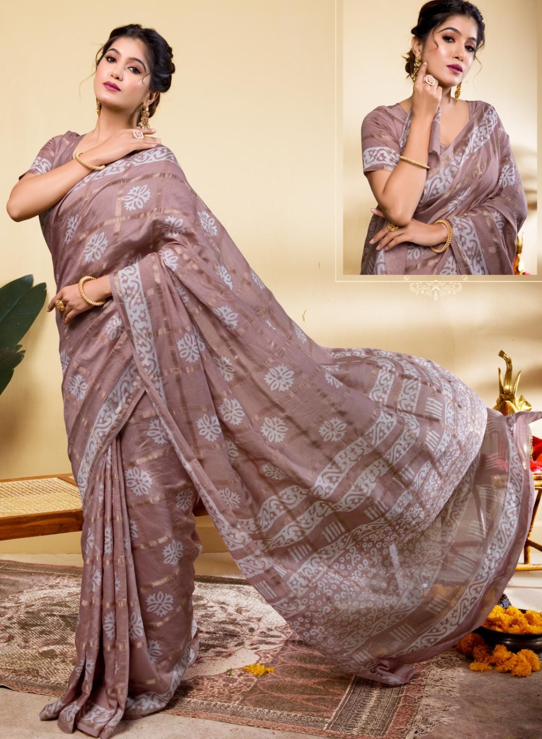 Step into effortless grace with this stunning Soft Viscose Saree, designed for the modern woman who values both comfort and style. Featuring a sophisticated dusty mauve/taupe hue, this saree is elevated by intricate white block-printed motifs and subtle metallic accents.