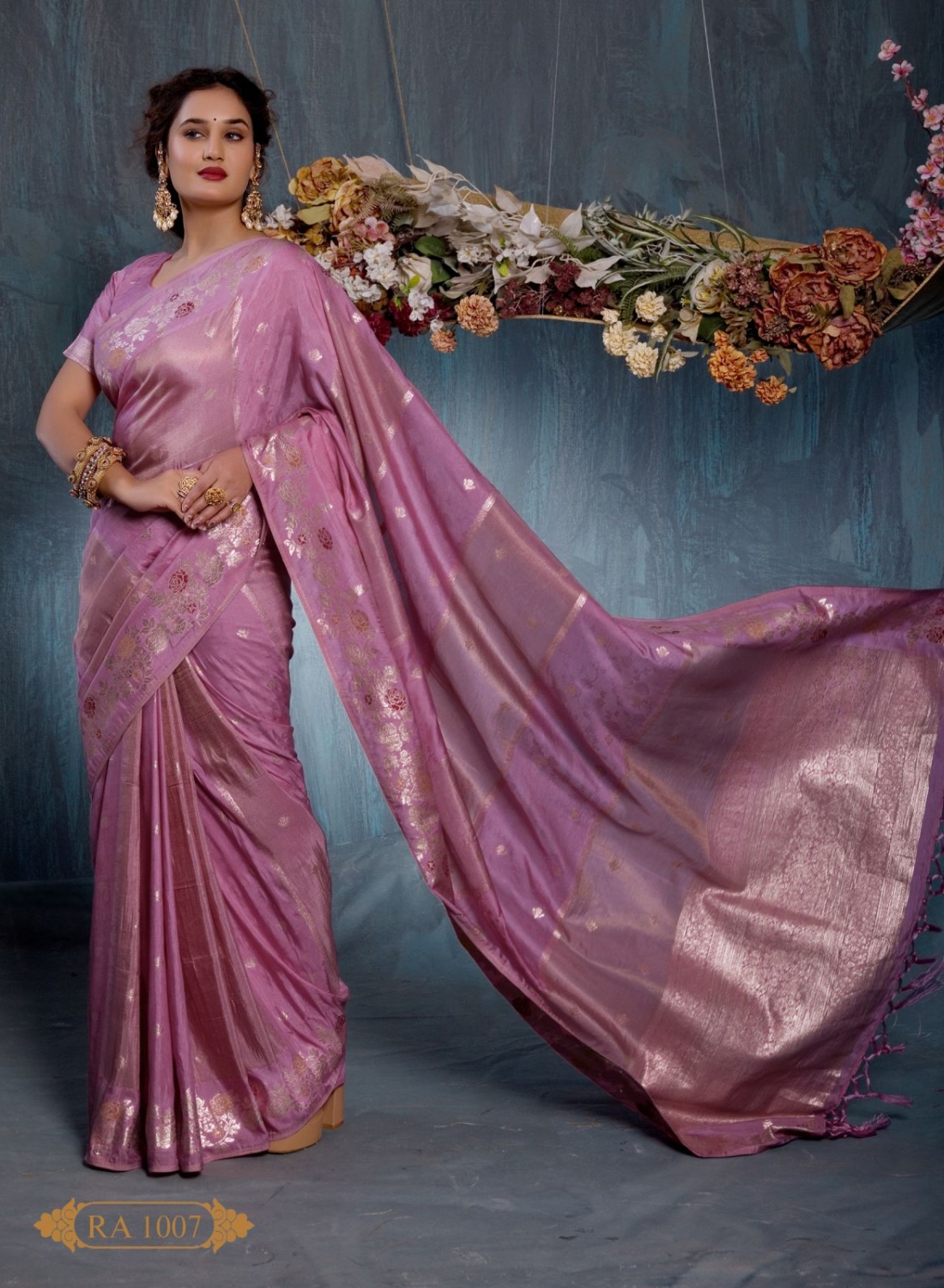 High-energy and high-shine. This orchid pink saree features a smooth, glossy finish with delicate floral patterns that transition into a heavily woven, dramatic pallu.