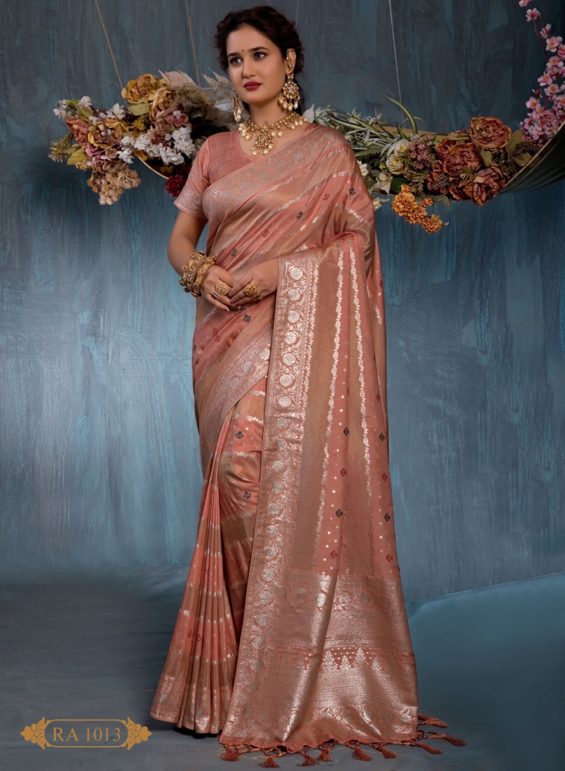 Capture the soft glow of a sunset with this Rose Gold/Peach Viscose Jacquard saree. This piece is perfect for weddings and festive occasions where you want a soft, romantic aesthetic.