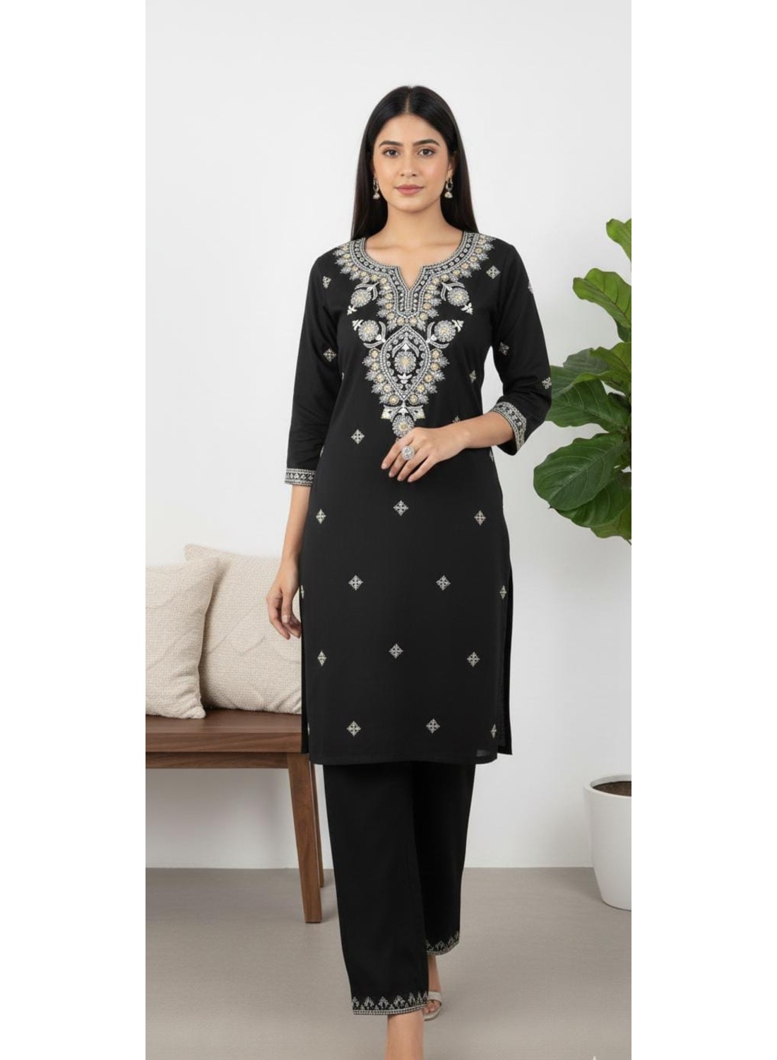 Neckline & Sleeves: Designed with a flattering notched round neckline and elegant three-quarter sleeves finished with embroidered borders.