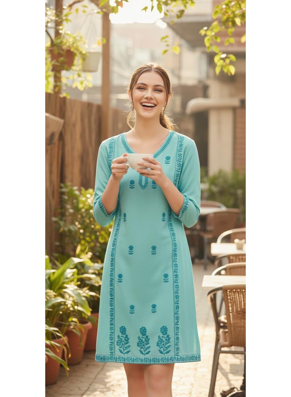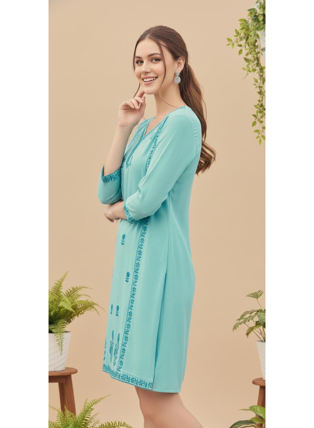 Embrace a fresh, breezy aesthetic with this charming Turquoise Blue Rayon Tunic. This piece combines a serene color palette with delicate artistry, making it a perfect choice for casual outings, brunch dates, or relaxed workdays.