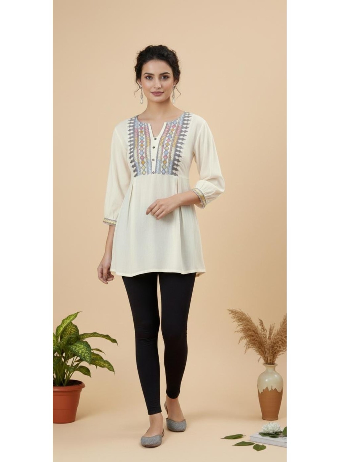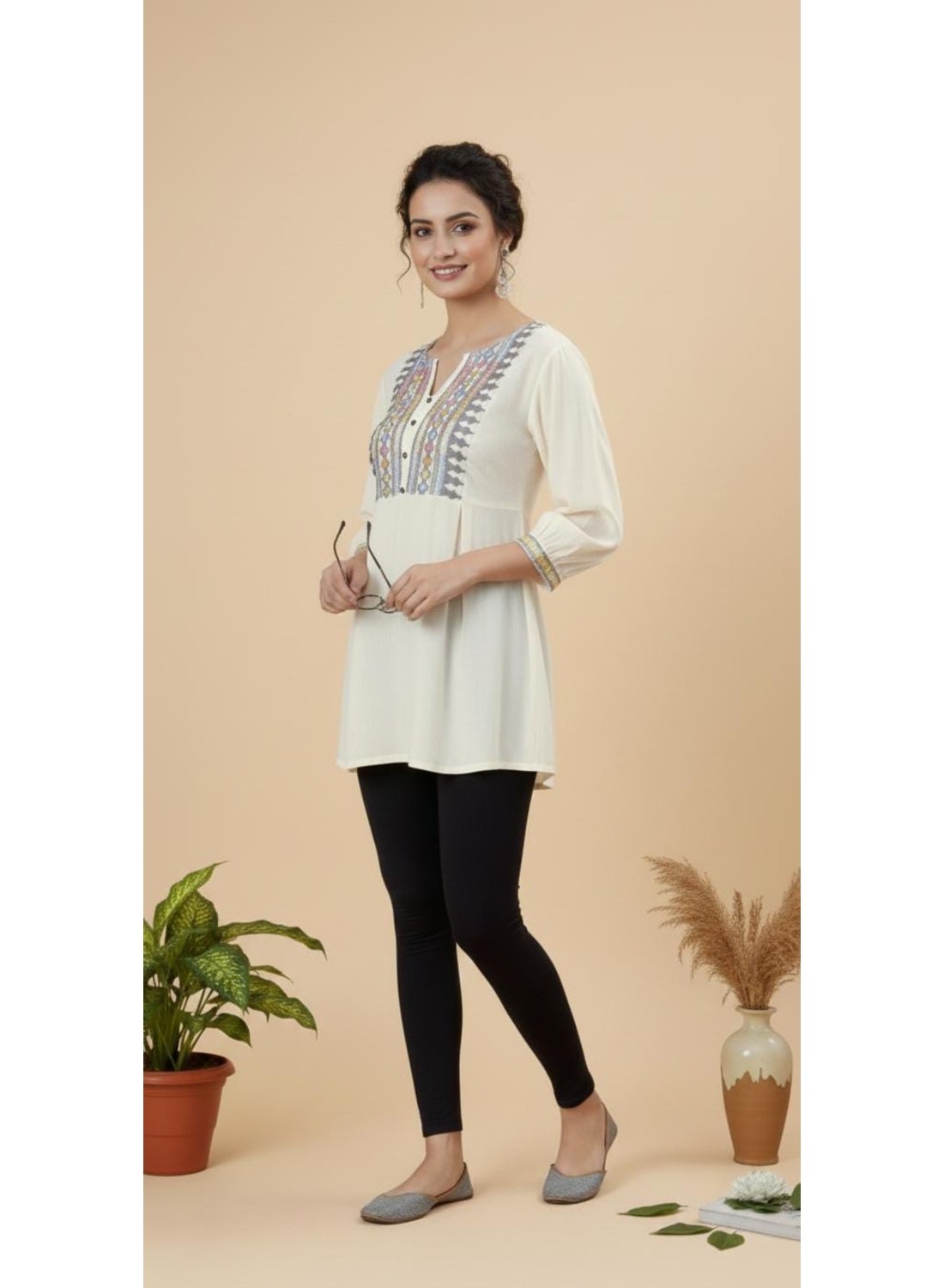 Elevate your everyday style with this elegant Off-White Rayon Tunic. Crafted from premium, breathable rayon fabric, this short kurta/tunic offers a perfect blend of traditional craftsmanship and modern silhouette. The soft, fluid drape of the rayon ensures all-day comfort, making it an ideal choice for office wear, casual outings, or festive gatherings.