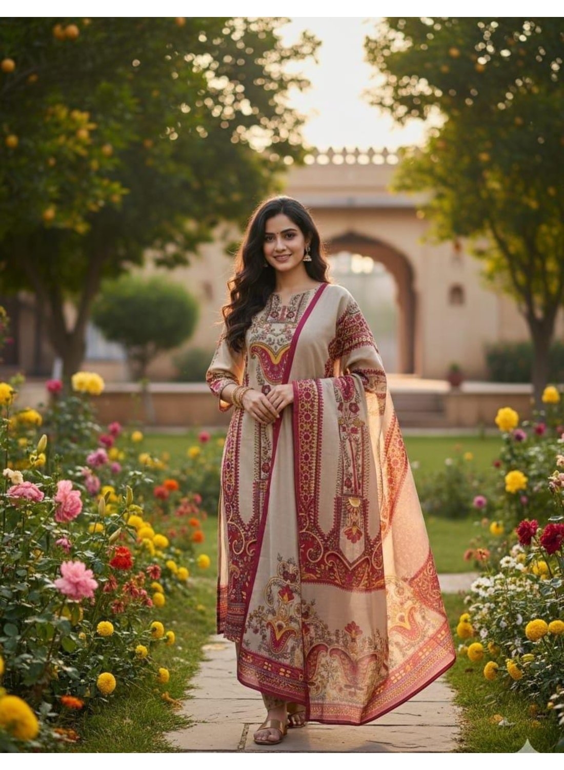 Product Name: Elegant Beige & Maroon Printed Suit Set.