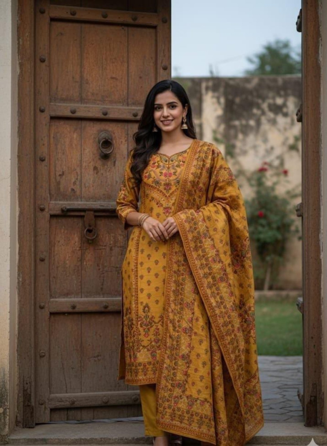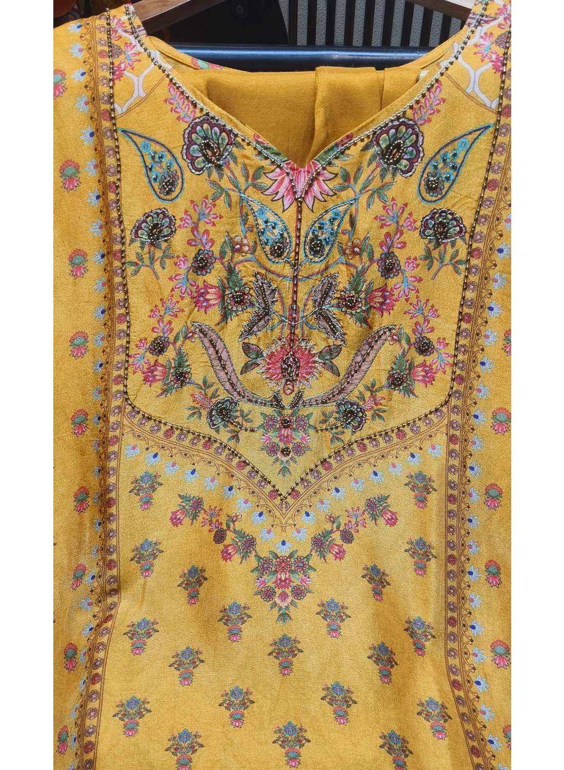 This vibrant 3-piece Pakistani-style ensemble is a fusion of traditional aesthetics and modern elegance. Featuring a rich mustard-yellow base, the outfit is intricately detailed with floral embroidery and contrasting digital-style prints, making it an ideal choice for festive occasions, office wear, or formal daily rituals.
