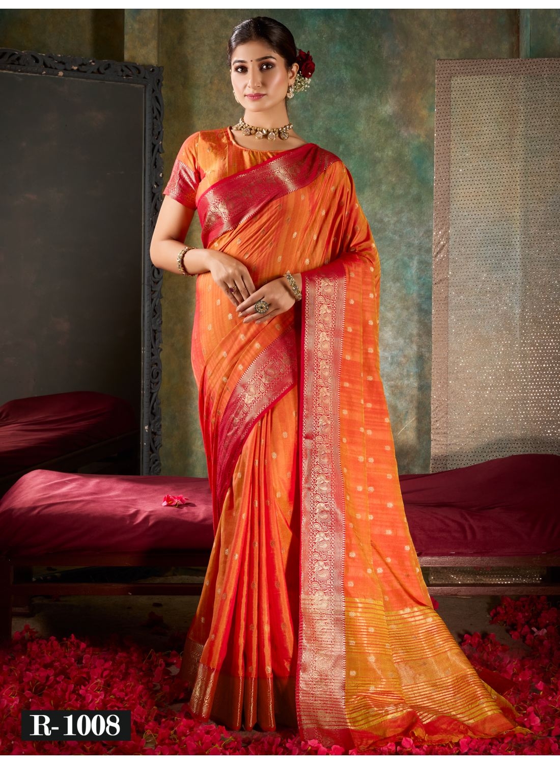 Tangerine Orange and Crimson Red Silk Saree with Gold Zari Border (R-1008)