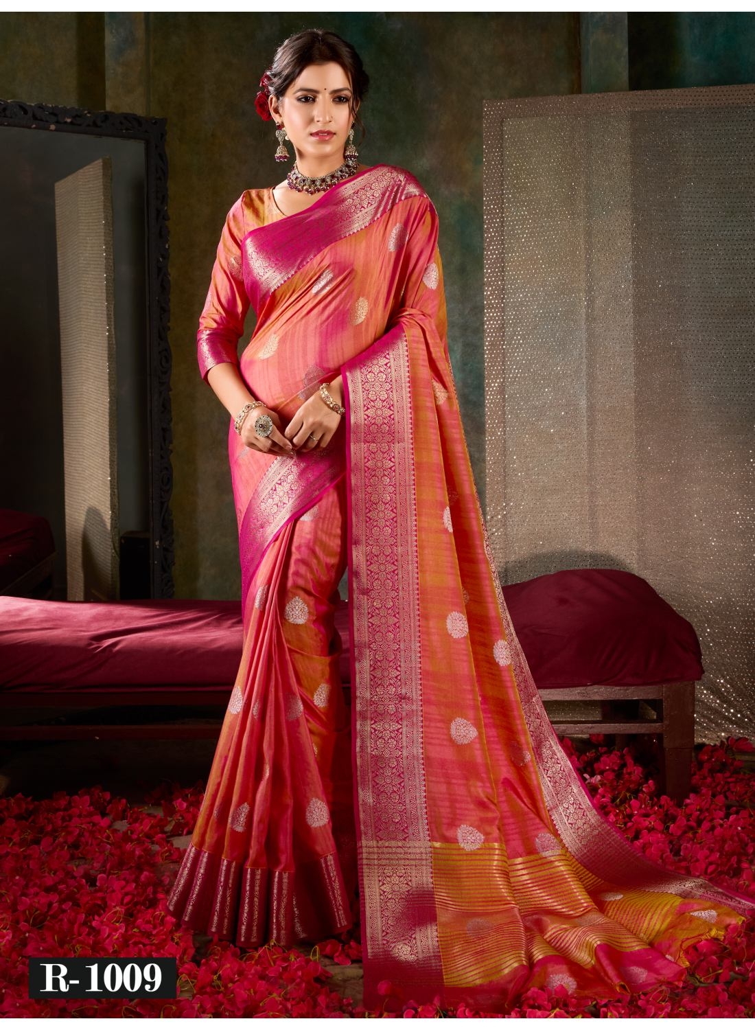 Vibrant Pink and Orange Banarasi Silk Saree with Traditional Floral Zari Work