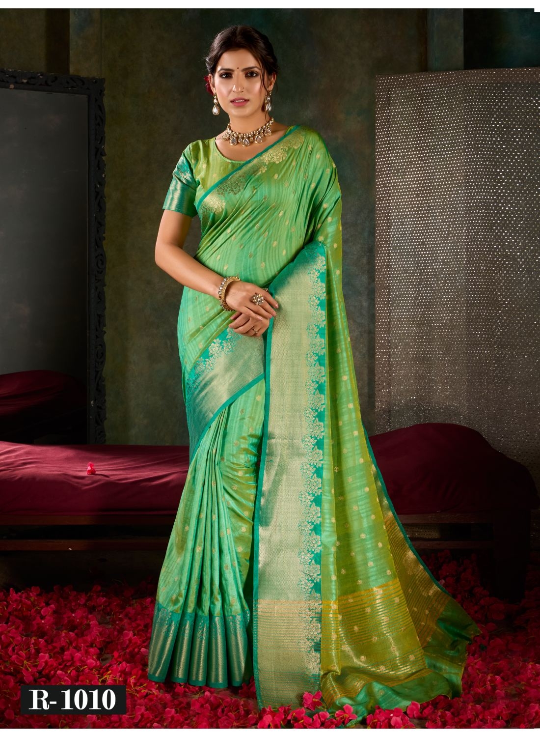 This refreshing R-1010 saree combines a mint green base with a deep emerald green border and pallu, featuring subtle gold zari buttis throughout the body and a wide, intricately woven floral border, finished with a matching green blouse.